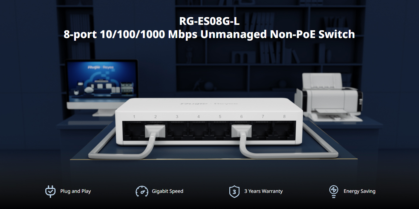 במתג לא מנוהל של חברת Ruijie, הניתן לגילוי דרך Ruijie Cloud. בעל 8 יציאות 10/100/1000Base-T, מארז פלסטיק, וכולל 3 שנות אחריות. מתאים למשרד ביתי.