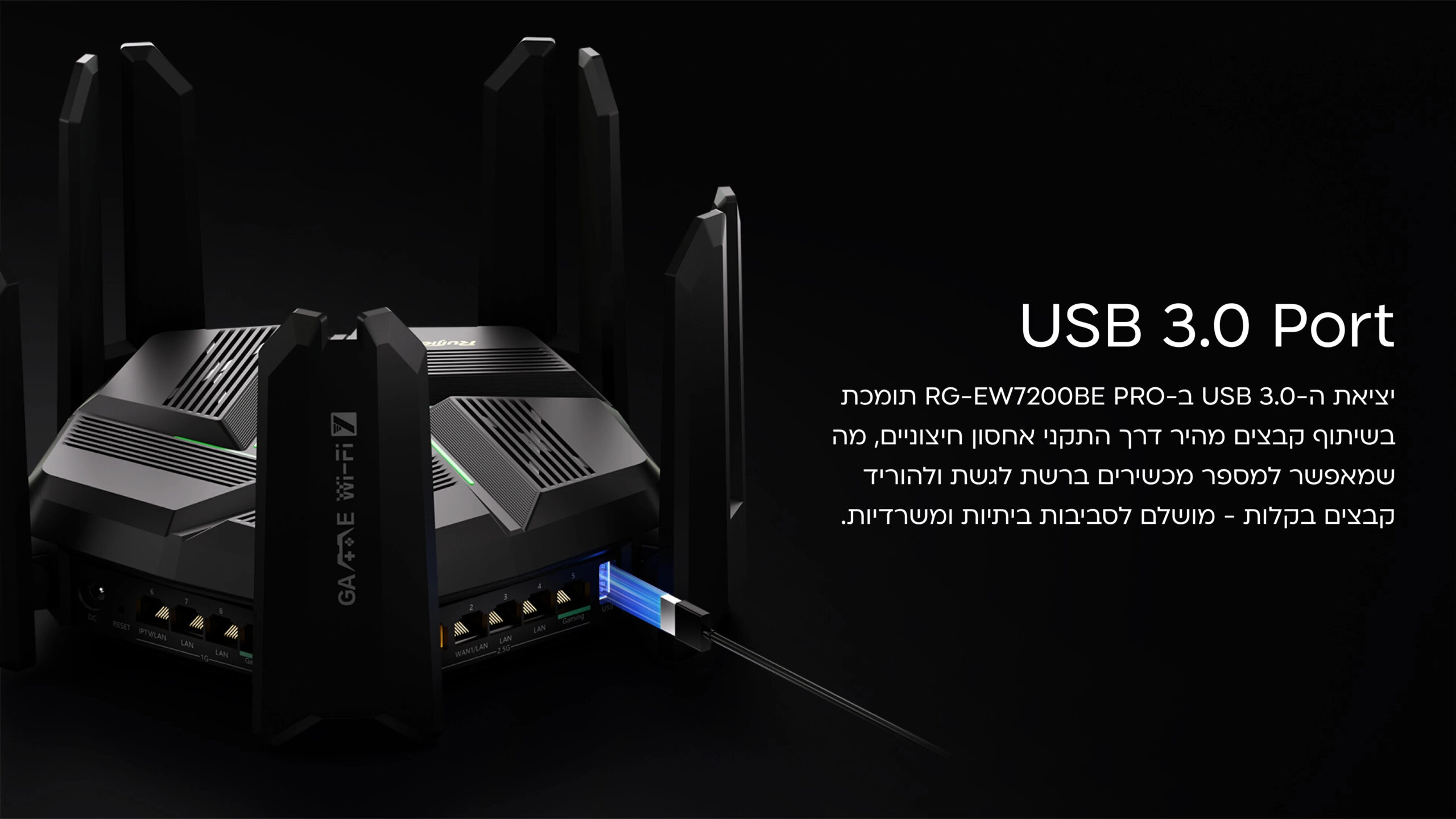 חוו ביצועי רשת שאין שני להם עם ה-RG-EW7200BE PRO . ה- RG-EW7200BE PRO הינו נתב חדשני המציע מהירויות של עד 7200 מגה-ביט לשנייה. הנתב כולל תמיכה ב MLO ו- MRU לביצועים מעולים, ומספק כיסוי ויציבות יוצאי דופן. עם מהירויות של עד 7200 מגה-ביט לשנייה, ה- RG-EW7200BE PRO מספק גיימינג שוטף וסטרימינג HD חלק לחוויית משחק יוצאת דופן. יציאות גיימינג בלעדיות של 2.5 ג'יגה-ביט לשנייה ו-Wi-Fi  לגיימינג מבטיחים חוויית משחק חלקה. עם 9 אנטנות ו-9FEMs  ה-RG-EW7200BE PRO  חודר דרך שלושה קירות ומבטל חורי כיסוי, ומבטיח כיסוי חזק ואמין שגורם למחסומים להיעלם ולמרחקים להיות זניחים. יציאת ה- USB 3.0 ב- RG-EW7200BE PRO תומכת בשיתוף קבצים מהיר דרך התקני אחסון חיצוניים, מה שמאפשר למספר מכשירים ברשת לגשת ולהוריד קבצים בקלות – מושלם לסביבות ביתיות ומשרדיות. עם Reyee Mesh תוכלו להיפרד מחורי כיסוי. Reyee Mesh תומכת בחיבור בין כל נתביReyee Wi-Fi 5, Wi-Fi 6  ו-Wi-Fi 7  הביתיים כדי להקים רשת המבטיחה נדידה חלקה וניהול מאוחד.